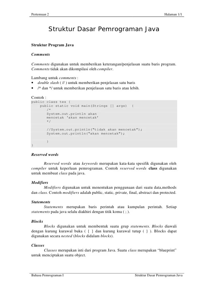 Saat ini java merupakan bahasa pemrograman yang populer digunakan, dan secara luas dimanfaatkan dalam pengembangan berbagai jenis perangkat lunak aplikasi . Oleh sebab itu, kita harus belajar konsep oop pada java. Java adalah bahasa pemrograman yang dapat dijalankan di berbagai komputer termasuk telepon genggam. Halaman ini berisi artikel tentang bahasa pemrograman komputer. 16 contoh pemrograman java dasar · 1.
